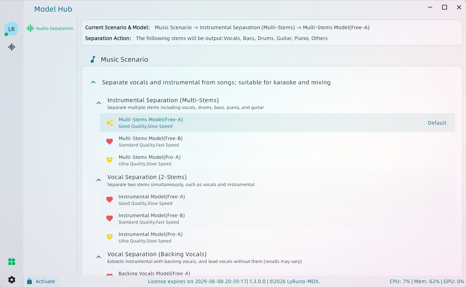 Solqua uses advanced AI for high-quality audio stem separation with no limits on file count or size. Supports dialogue extraction, background music, sound effects, instrumentals, individual instruments, and noise reduction.